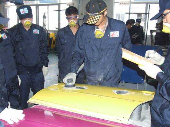 老師們實(shí)操磨灰機(jī)進(jìn)行車(chē)身修復(fù)