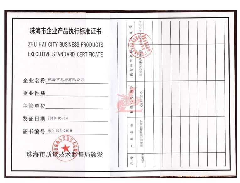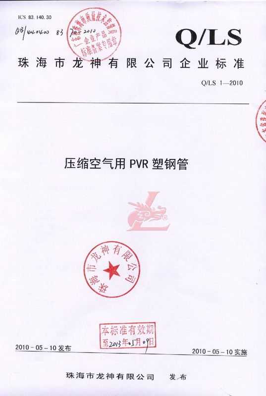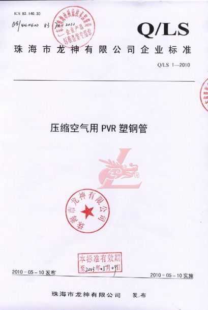 龍神壓縮空氣PVR塑鋼管成功申請企業(yè)執(zhí)行標準 2010年5月珠海市龍神有限公司“壓縮空氣PVR塑鋼管”得到珠海市質(zhì)量技術(shù)監(jiān)督局認可,特此頒發(fā)“壓縮空氣PVR塑鋼管企業(yè)執(zhí)行標準”,龍神公司在嚴格執(zhí)行標準下,保證產(chǎn)品質(zhì)量。 2010-05-20 9735