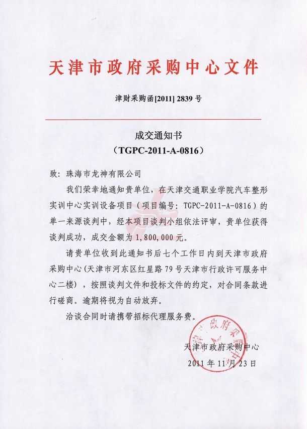 我們榮幸的通知貴單位,在天津交通職業(yè)學院汽車整形實訓中心實訓設備項目(項目編號:TGPC-2011-A-0816)的單一來源談判中,經本項目談判小組依法審評,貴單位獲得談判成功,成交金額為1,800,000元。